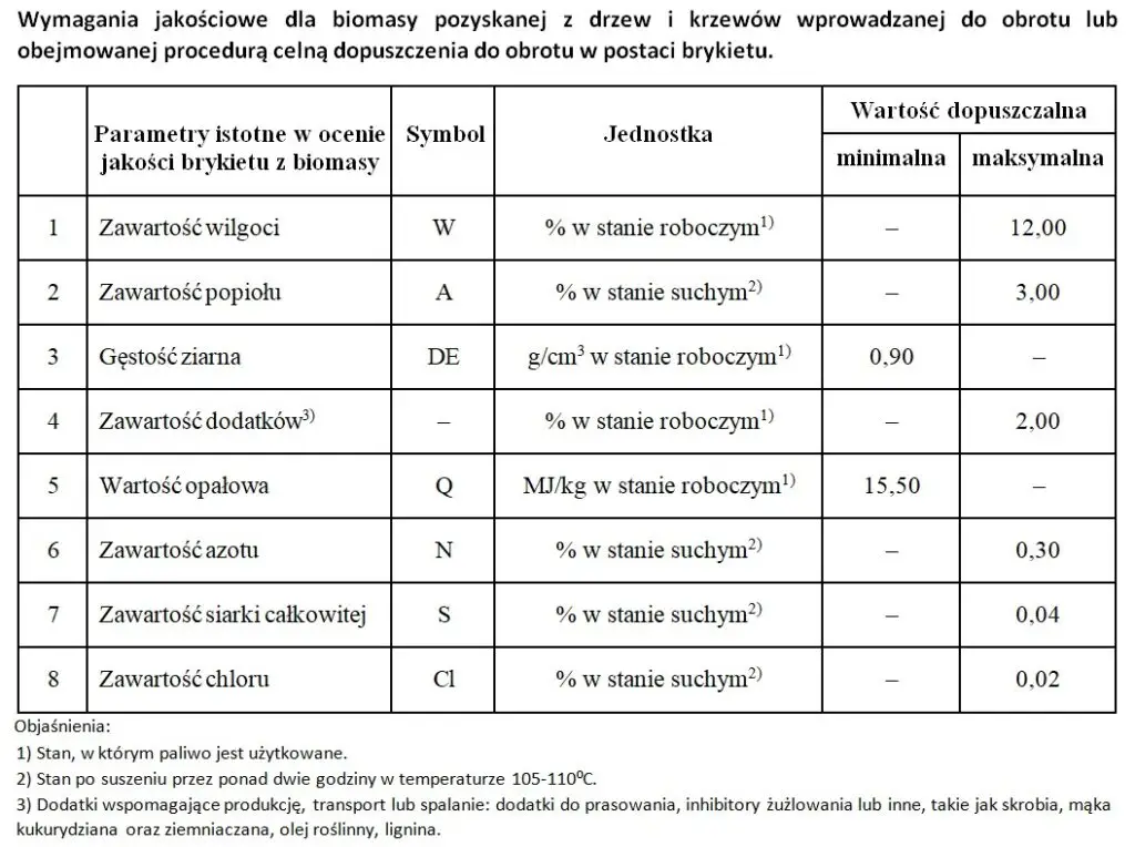 Wymagania jakościowe dla biomasy pozyskanej z drzew i krzewów, o której mowa w art. 2 ust. 1 pkt 4a lit. C ustawy z dnia 25 sierpnia 2006 r. o systemie monitorowania i kontrolowania jakości paliw, wprowadzanej do obrotu lub obejmowanej procedurą celną dopuszczenia do obrotu w postaci brykietu lub peletu z przeznaczeniem do użycia w gospodarstwach domowych lub w instalacjach spalania o nominalnej mocy cieplnej mniejszej niż 1 MW, określa stosowny załącznik do rozporządzenia Ministra Klimatu i Środowiska z dnia 8 maja 2025 r. (Dz.U. 2025 poz. 618).