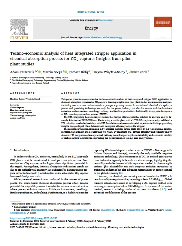 Z przyjemnością informujemy, że nasz najnowszy artykuł pt. „Techno-economic analysis of heat integrated stripper application in chemical absorption process for CO2 capture: insights from pilot plant studies” został opublikowany w prestiżowym czasopiśmie Energy! Wzrost świadomości dotyczącej emisji dwutlenku węgla sprawia, że coraz większe znaczenie zyskują technologie jego wychwytywania. Jedną z najbardziej obiecujących metod jest absorpcja chemiczna z wykorzystaniem amin, stosowana nie tylko w energetyce, ale także w branżach o trudno redukowalnych emisjach, takich jak przemysł cementowy, hutnictwo, rafinerie czy produkcja nawozów. Ponadto technologia ta może wspierać wychwytywanie CO2 z biogenicznych źródeł węgla (BECCS).