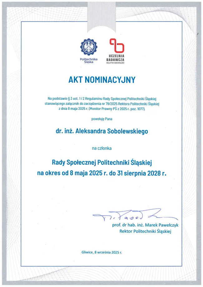 Powołanie  Dyrektora Aleksandra Sobolewskiego do Rady Społecznej Politechniki Śląskiej