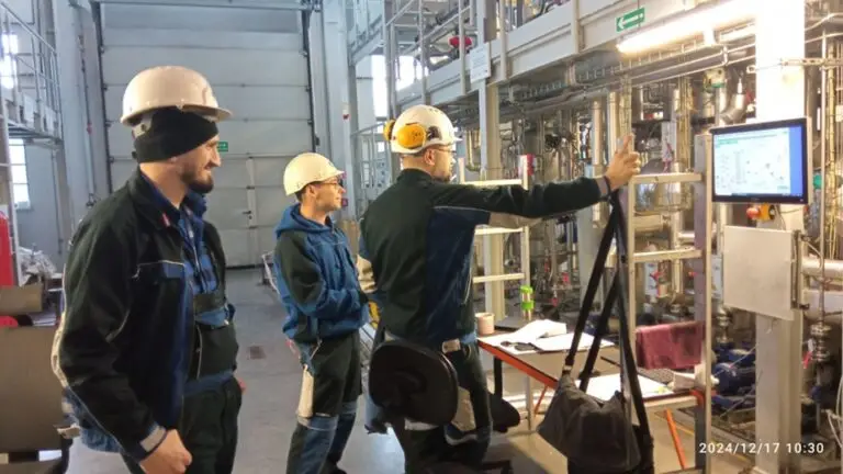 W czasie prowadzenia testu wielogodzinnego spalania z integracją wychwytu CO2, od lewej stoją: Szymon Dobras, Tomasz Spietz, Tadeusz Chwoła.