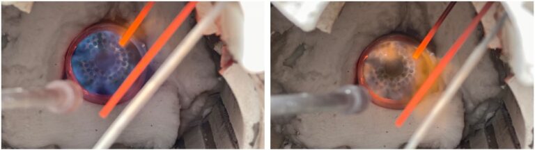Płomień podczas spalania gazu ziemnego (z lewej) oraz gazu ziemnego, amoniaku i wodoru (z prawej) w otwartej komorze.