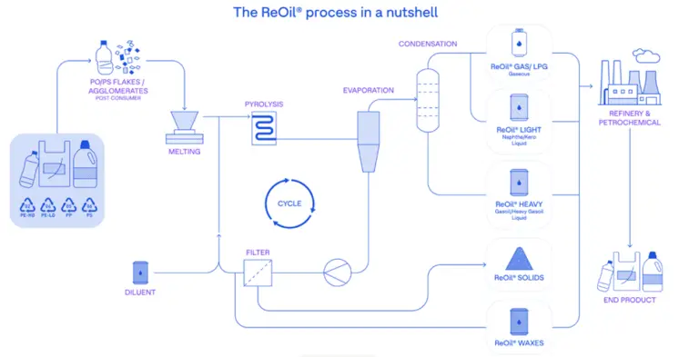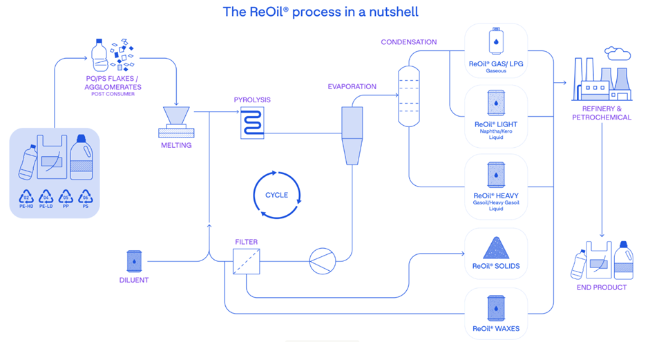 Wprowadzane do procesu ReOil® zużyte tworzywa sztuczne (polietylen, polipropylen oraz polistyren) są wstępnie sortowane i rozdrabniane do postaci tzw. płatków, a następnie topione w ekstruderze. Ze względu na dużą lepkość, wstępnie stopiony plastik mieszany jest z rozpuszczalnikiem, pochodzącym z innych procesów w rafinerii, co umożliwia uzyskanie konsystencji mieszaniny zapewniającej łatwy transport rurociągami. Następnie przygotowany w ten sposób surowiec wprowadzany jest do reaktora, w którym zmieszane strumienie odpadów polietylenu (PE), polipropylenu (PP) i polistyrenu (PS) ulegają termodestrukcji, rozkładając się na szereg węglowodorów o krótszych łańcuchach poprzez ogrzewanie beztlenowe („kraking”). Powstająca mieszanina węglowodorów może być przetworzona na szereg nowych produktów petrochemicznych i materiałów o takiej samej jakości, jak produkty wytwarzane z surowców kopalnych.